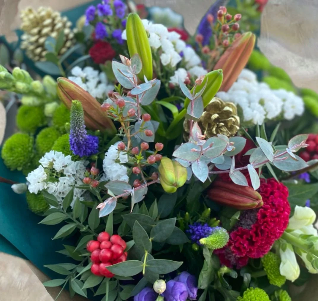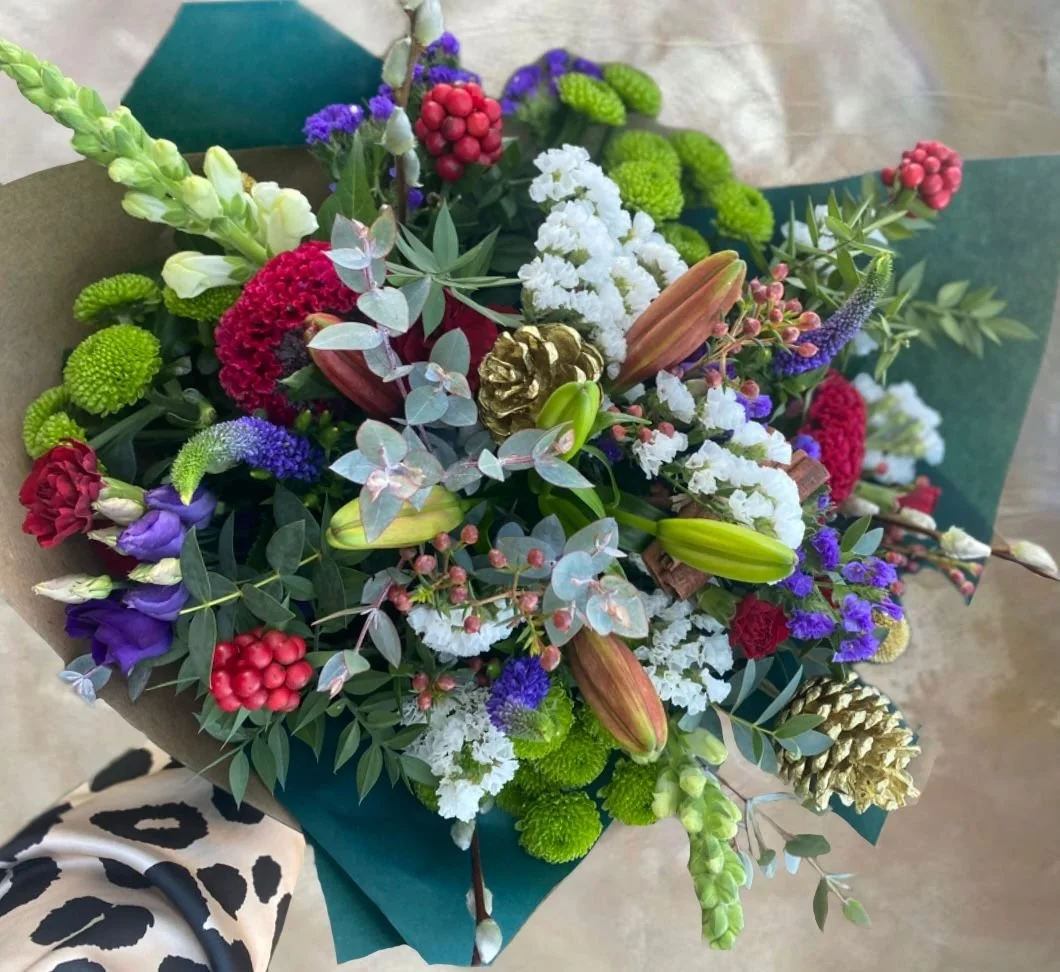 Bring the magic of the season into your home with the Christmas Splendour Bouquet. This luxurious arrangement combines the richness of red, purple, and white blooms, elegantly paired with seasonal foliages and accents of metallic and natural pine cones. Perfectly finished with festive packaging and ribbon detail, this bouquet captures the essence of Christmas with sophistication and style. Ideal as a gift or a centrepiece for your celebrations.