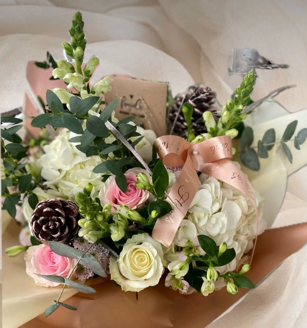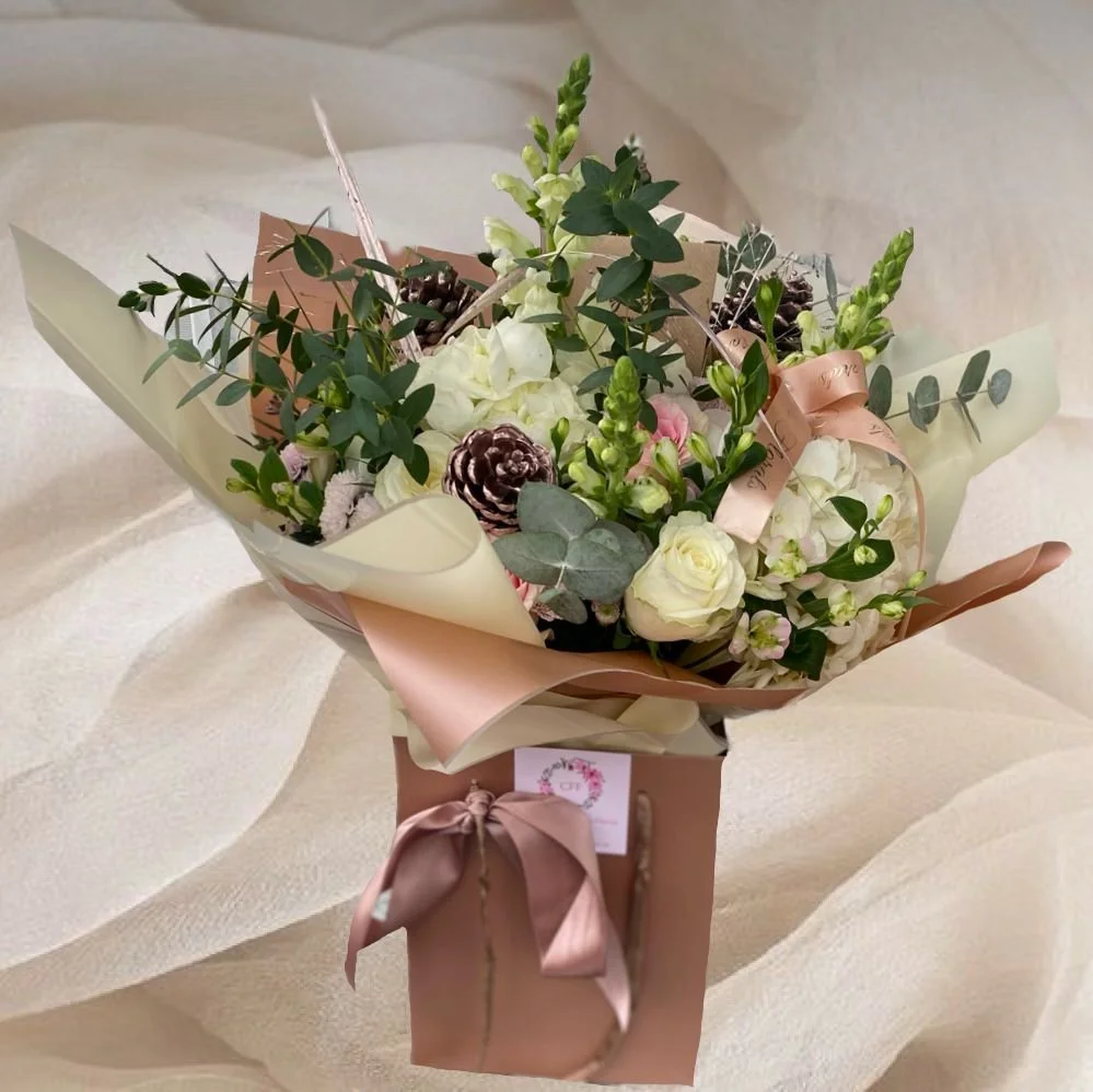 This exquisite arrangement captures the soft elegance of the season with delicate pinks and creamy whites. Featuring premium roses, hydrangeas, and seasonal blooms, it is beautifully complemented by sparkling pinecones and festive foliage. Presented in luxurious packaging with a satin ribbon, this bouquet makes a perfect gift or centrepiece to add a touch of Christmas magic.